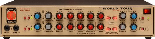 The WT1205 World Tour Bass Head features dual 7025 preamp tubes to drive 2 separate channels that can be used individually or blended for dual channel instruments such as The Stick. Each channel features Dynamic Bass and Treble boosters, a unique EQ center (4-band on Channel 1, 3-band with sweepable mid on Channel 2), pre- and post-effects loops, and variable compression. Using automix technology, the studio-quality DI (selectable pre- or post-EQ) always sends the active channel(s) to the console.Dial in your sounds and then use its 1200W of RMS power to drive a variety of compatible multiple-speaker arrays. Execute changes on the fly with the included footswitch for mute, channel switching, master gain booster (the solo button), and enhance bypass.